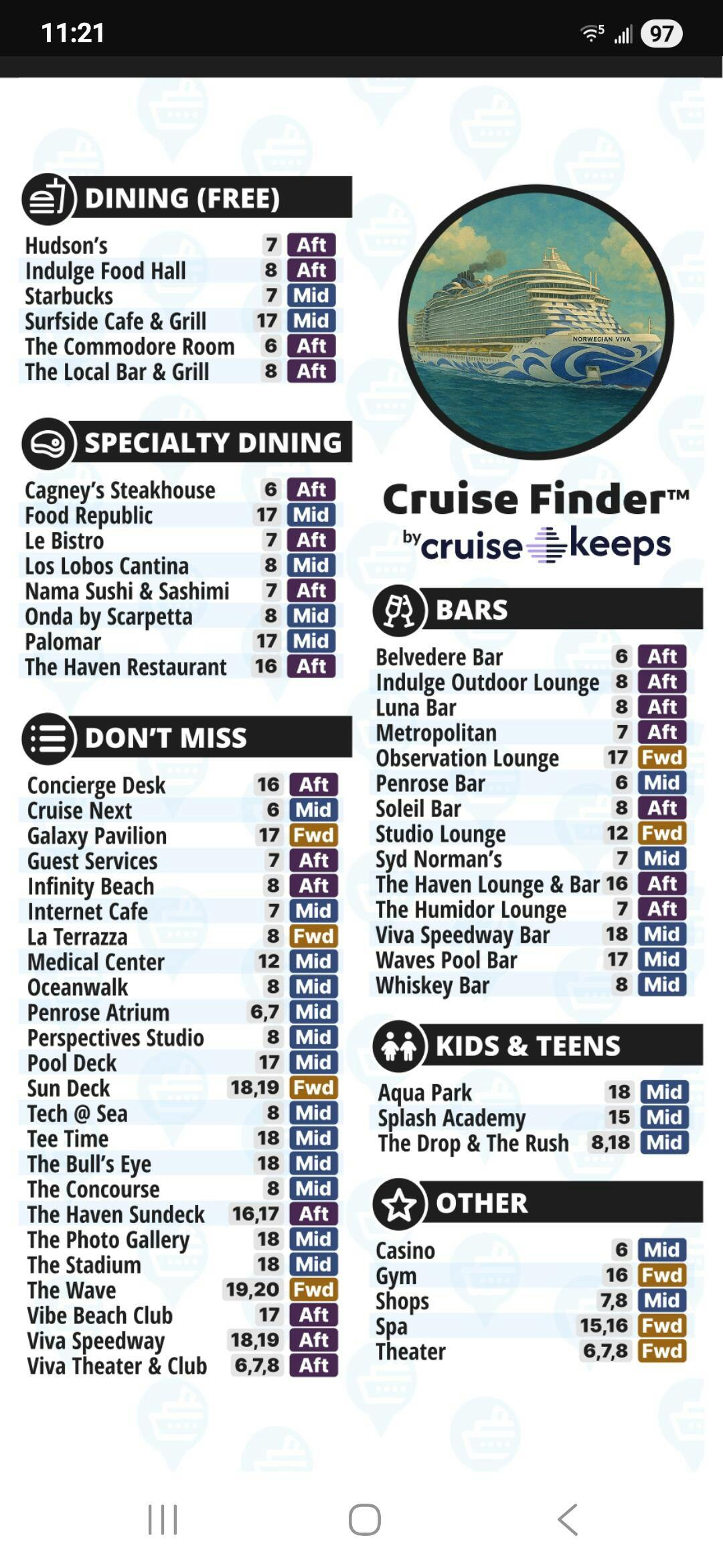 Our Norwegian Viva Deck Card is the "cheat code" for your upcoming cruise vacation! Your cruise ship is massive. Our Phone Locator AND Deck Finder cards will make sure you know your Norwegian ship from top to bottom. Included in your purchase are the following: