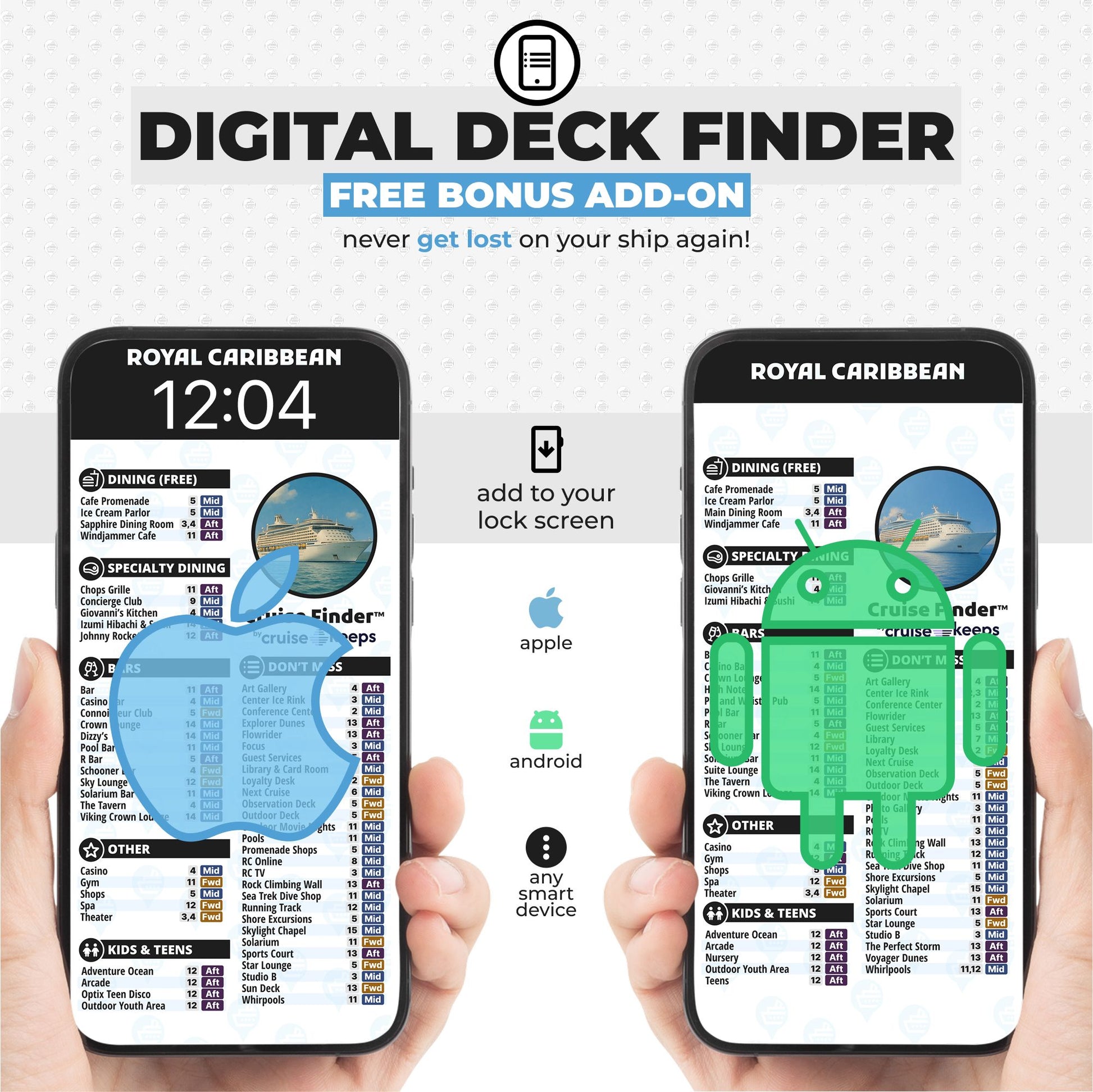 This practical accessory comes with both waterproof printed cards and digital deck finder cards, making it easy to navigate every restaurant, bar and venue on the Oasis of the Seas.